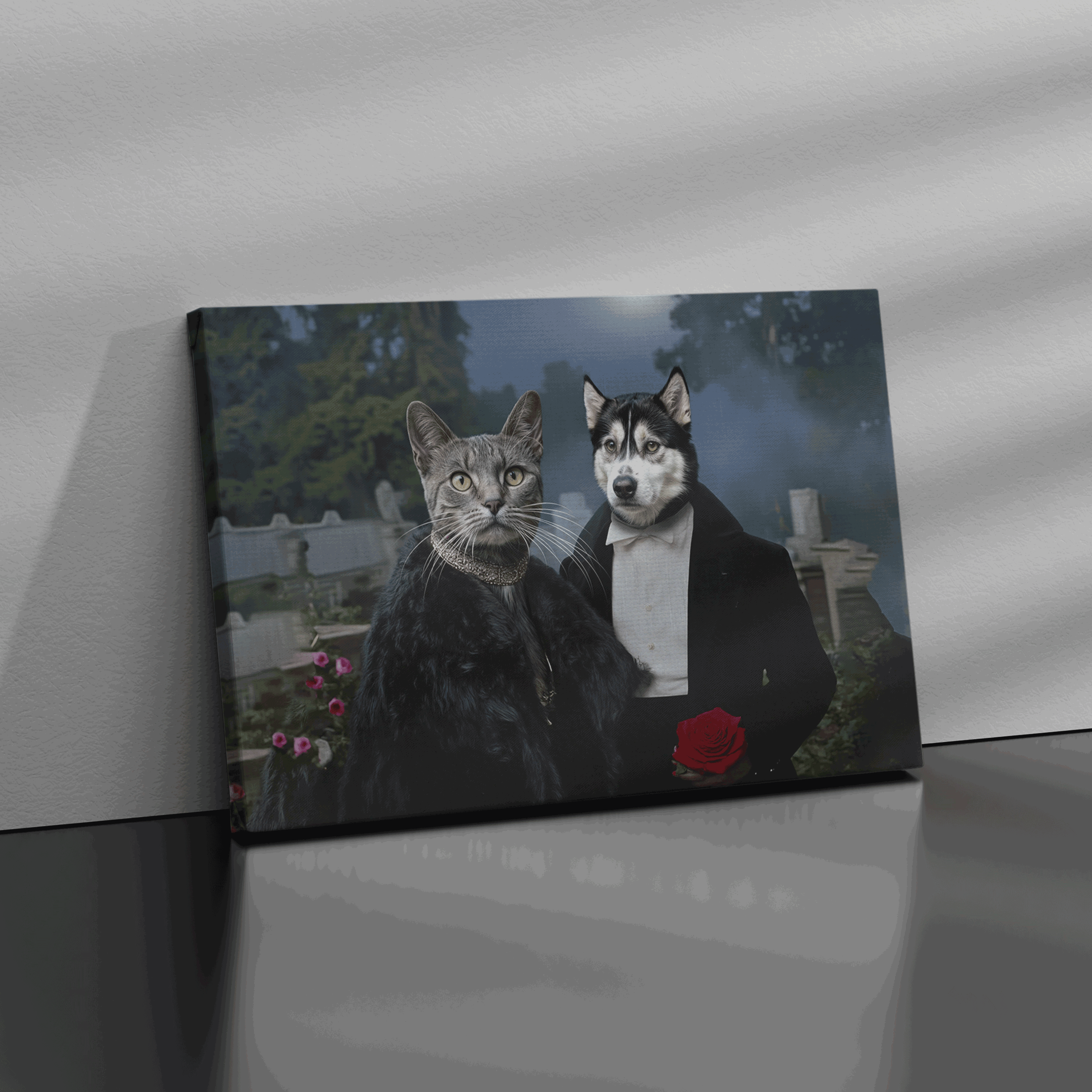 The outfits are regal, the expressions are haunting, and the entire composition is fantastic. It looks like a scene from a classic vampire film!