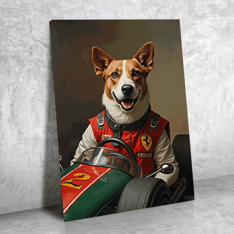 Custom Racing Car Driver Pet Portrait – Personalized Pet Artwork - Canvas / Medium (12 x 18 in)